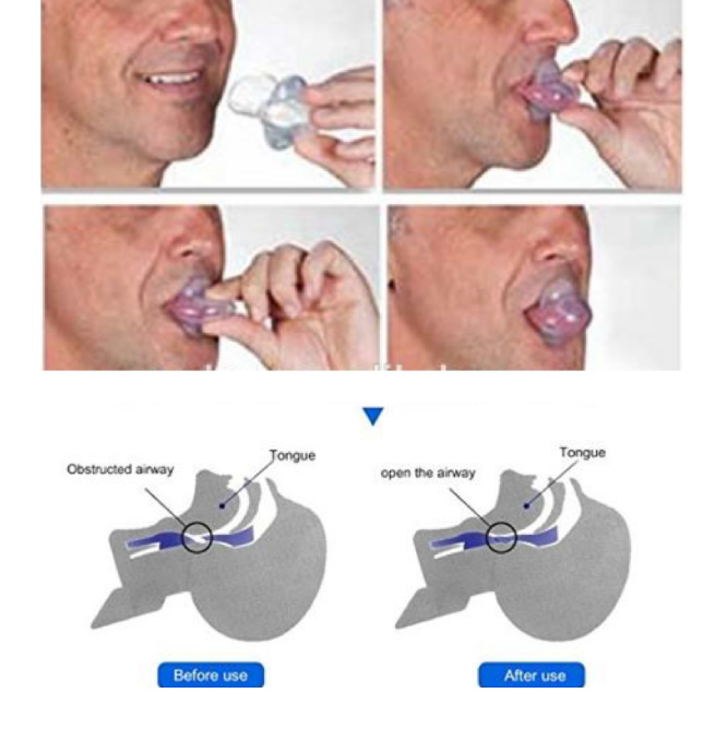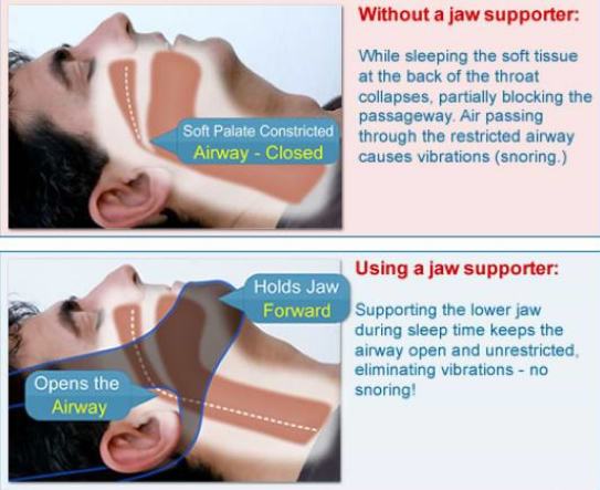 These prostheses work to prevent the tongue from falling back as well as causing a forward movement of the jaw (mandible). The forward movement of the jaw keeps the airway patent and prevents turbulent airflow which is responsible for the acoustic reverberations in snoring. This can be seen in Figure 1 below, where the jaw is held forward and prevents snoring with an open mouth. This has the added advantage of preventing dryness of the oral cavity (i.e. throat, tongue and oral membranes) as the mouth is kept closed and the oral cavity is not exposed to the ambient air.